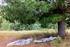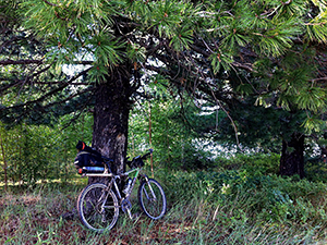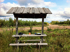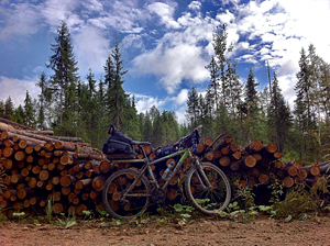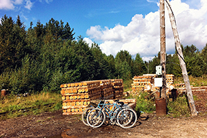 С обеих сторон придвигается плотный кустарник. Обыкновенные на вырубах канавы вдоль насыпи здесь уже зарастают и сегодня из этих зарослей постоянно выпархивают куропатки, пролетают по-над дорогой и снова скрываются средь ветвей. Грунтовка тянется до самого горизонта, дикая и пустынная. Следы от шин на песке, да редкие птицы - вот и все мои спутники на этом пути. По краям рвов отцветают Люпины. На самой линии горизонта, в точке, в которую упирается трасса, торчит одинокое дерево - где-то там ожидается крутой разворот на 90 градусов и последний участок технологической перемычки, которая, я надеюсь, приведет меня к Целюгской трассе. И ежели оправдаются эти надежды, устрою-ка я перекус на том повороте. Привал! Наконец-то… Коли уж довела эта трасса нас с великом до этого поворота, то можно рассчитывать и на то, что и последний участок её окажется проезжабельным. А это значит, как минимум, что я выберусь на дорогу, ведущую в южном своем направлении до Бестужево. Рассчитывать будем, конечно, на лучшее, на северное ее направление. Но иметь за спиной запасной вариант все же не лишнее. Какое же наслаждение уронить облепленный грязью, отягощенный багажником велик прям на обочину, стащить мокрую от дождя и пота бандану, скинуть жесткие велосипедные туфли и походить босиком по мягкому мху, по траве да по лужам. Стоять, уперев руки в боки, глядя на медленно проплывающие облака, вертеть головой во все стороны, а то и просто, прикрыв ненадолго глаза, вбирать всей кожей, всем телом тепло и покой, тишину, разнотравие, растворенные запахи, легкое шевеление ветра и собственное, различимое в этом безмолвии, размеренное сердцебиение. И самое главное - не торопиться. А на данный момент я проехал уже 33 с половиною километра, однако. Немало. Имею право расслабиться, это хорошая скорость. Если так дело пойдет и дальше, у меня есть все шансы добраться до цели. Велосипед лежит на дороге и приходится отцеплять багажную сумку от самой рамки багажника, иначе копаться с его содержимом просто-таки неудобно. Замок сумки, изрядно забитый песком, перемешанным с глиной, сдвигается туго, приходится его предварительно чистить. Справившись с этой задачей, размещаюсь на лавочке под навесом, заботливо установленном здесь безымянными зодчими. Что на обед? Обойдемся без каши. По пути моя пища - пакетики с гелями и я не особенно голоден. Но посидеть не спеша и выпить горячего чая с какой-нибудь сладостью - хочется.