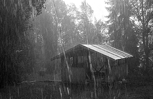 Жесткие лавки, отсутствие спальника - вместо него клеенка, приготовлена на случай дождя - и постепенно остывающее помещение не слишком способствуют погружению в полноценный глубокий сон. Рассказы Осипова о медведицах с медвежатами и волках, которые в августе выводят подрастающее поколение на дороги и учат их там, на открытых пространствах охотиться на беспечную, рассеянную добычу всплывают теперь в голове с особенной четкостью. За стеною звенит тишина и тишина эта - их территория. Волков и медведей, лисиц, росомах, рысей. И, положа руку на сердце я совсем не готов к такой встрече. Как вести себя с ними, не знаю. Такие рассказы хорошо слушать в компании, потешаясь над незадачливыми и смешными охотниками. А вот здесь и сейчас все серьезно и по-настоящему. Кто знает, кого из лесных обитателей принесет нынче к домику, заинтересованного необычными запахами, звуками и просто в поисках пищи. От последнего слова становится совсем уже жутковато. Окончательно выводит из сна какое-то шебуршание, настойчиво, с перерывами раздающееся где-то под дверью. Словно бы кто-то любопытный, назойливый проверяет ее на прочность - копнёт, задумается, снова копнёт. Неужели ж я все-таки стал интересен какому-то местному жителю. Не упуская из головы рассказов о диких животных решаю все же пойти и проверить, кто там мешает мне спать. Но на улице нет никого, только ночь. Августовская, непроглядная. Фонарик выхватывает мокрые ветки деревьев да песок на дороге, сдобренный моими следами. Так выхожу пару раз и понимаю только на третий, что источник звука внутри, не снаружи. Это мелкие черные мыши и орудуют они в угловом шкафчике, доканчивая начатую ими когда-то крупу, уже рассыпанную по полкам. Возмущенный такой наглостью и соседством решительно выставляю шкафчик на улицу - ни в чем себе не отказывайте - потому что как-то прогнать, напугать и утихомирить этих юрких и осмелевших животных нету возможности. Посмеявшися над своим ночным страхом и на время избавившись от неожиданной этой напасти, возвращаюсь на неуютную полку в надежде спокойно проспать уже до утра. Под утро в доме прохладно. Полиэтилен, служащий мне одеялом не слишком спасает. Проваливаясь ненадолго в сон как-то дотягиваю до утренних сумерек. Всю ночь преследует одна только мысль - что будет с погодой. Стартовать сегодня имеет смысл пораньше, ибо путь впереди тяжелый и хотя в запасе имеется еще один день - на поезд до Авнюги мне нужно поспеть послезавтра к пяти часам вечера - рассусоливать особо не стоит, шутки с дождем в тайге плохи. И потому часов в восемь собираюсь уже подниматься. Но вот незадача, вместе с серым рассветом приходит такой же неясный, фоновый шум - то ли молотит, то ли царапает что-то по крыше. Не желая еще расставаться с последней надеждой, что эти лишь ветер качает деревья, вываливаюсь за порог, моргаю слепыми глазами и отчетливо понимаю, что моих минус шести более, чем достаточно, что б рассмотреть плотную завесу дождя, поливающего дорогу. Приплыли. Теперь ехать некуда. Провести день на месте, дожидаясь погоды? Поворачивать к югу, в Бестужево? А когда?... В любом случае ясно, что не сейчас. В безнадеге заваливаюсь обратно на полку, делать-то все равно нечего. И даже в каком-то расслабленном, более похожем на сон состоянии валяюсь еще до 11-ти, когда дождь, наконец, затихает. При дневном уже свете вых