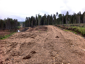 С этой точки уже, с этого поворота открывается как минимум две возможности - или двигаться по запланированному маршруту или в любой момент развернуться обратно, на юг, к Студенцу - а это прямая дорога на Костылево. По крайней мере, это известный и гарантированно проезжабельный вариант. Это неплохо. Потому что по-прежнему бродят по-прежнему хмурые тучи, все так же хрустит перемазанная трансмиссия и вымокшее седло безбожно скрепит, холодит заляпанную до самой банданы, отсыревшую пятую точку. Продолжая забрасывать за спину потоки воды, поворачиваю все же на север. Ехать по трассе попроще. Чувствуется утрамбованное лесовозами полотно. Эта трасса широкая - при желании здесь могут разъехаться две встречных машины. По пути встречается еще один поворот - на УЛК-шное охотохозяйство под названием Тушмино. Интересно, что там. Дорога довольно заметная, хотя на снимках ее и не видно. Вырубов, впрочем, там нет и скорее всего она тупиковая, и никем кроме охотников не используется. Проезжая в совокупности 6 км по трассе, достигаю таки своего поворота! Здесь указатель на 24, 25, 26 и 27 кварталы. Прямо на повороте - штабеля леса, приготовленные для отправки и особенная табличка, предупреждающая о том, что ты выезжаешь на технологическую дорогу, проезд по которой для грузового транспорта запрещен. Кроме того, который занят на вывозе леса, конечно. Здесь начинаются те самые выруба, которые мне так нужны - вот по этим дорогам я как раз и рассчитываю выскочить к Целюге. Кварталы раскинулись с запада на восток на многие километры и с одной стороны, то есть с запада к ним примыкает Студенецкая трасса, на которой я сейчас нахожусь, с востока - трасса идущая от Глубокого через Развилку вдоль Юмижа, мимо Целюги. Эта восточная трасса после моста и избушки на Целюге поворачивает снова на запад и проходя чуть посевернее вновь стыкуется с Студенецкой, образуя что-то вроде квадратика. По этой дороге мы в августе 2013 года путешествовали с компанией на УАЗе, надеясь проехать до Соезерска. Выбрали тогда неправильный путь, понадеявшись на спутниковые снимки и уперлись в провалившийся мост через Дьяков ручей, который впадает чуть позже все в тот же Юмиж. Отчаявшись попасть в Соезерск, мы вернулись на трассу и проехали через Целюгу вот этой самой северной перемычкой на Студенецкую трассу и дальше - на Стрелку, как здешний народ называет группку поселков еще дальше, за Кодимой - Монастырскую, Носовскую да Шахановку. Хороша эта северная перемычка! Накатанная и прямая. УАЗ, ведомый Андрюхой летел по этой дороге со скоростью ветра. Деньки тогда стояли погожие и путешествовать было одно удовольствие. Вот только сейчас мне эта дорога совсем походит - делать крюк, ехать еще дальше на север в такую погоду и увеличивать расстояние еще километров на 30 совершенно не хочется. И потому вся надежда на проходимость этой, вот, технологической трассы. Судя по снимкам, она должна быть хорошей, просто обязана. И тот факт, что невзирая на обстоятельства я до нее все же доехал внушает уверенность. А куда серьезнее сказывается на настроении, доставляет изрядную порцию оптимизма неожиданно разгулявшаяся погода! Стоило мне достичь поворота, как в клубящихся тучах появились разрывы, серую хмарь сорвало, разметало, раскинуло и мокрые бревна, листва на деревьях, блестящий от дождевой воды металл велика - 