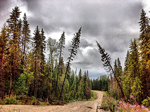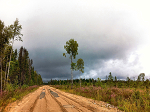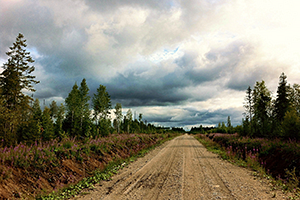 Долго ли, коротко ли, но солнце начинает клониться к закату. Время давно уже послеобеденное и длинные тени перечерчивают дорогу. Подсохший песок ее верхнего слоя создает обманчивое впечатление твердого грунта. Но это неправда - под этим поверхностным слоем все так же насыщено влагой. Световой день предстоит еще длинный и разгулявшуюся погоду и это время надо использовать. До ближайшего поворота мне, судя по карте, осталось немного, но дальше - прямой длинный участок на север и от следующего поворота - единственная дорога до Целюгской трассы. Все просто. Ехать теперь несколько легче. Солнце играется с яркой, вымокшей зеленью, по небу тянутся разношерстные, рваные облака - расползающиеся колтуны серой ваты, многоглавые, белоснежные терема громоздятся в недосигаемой дали, чуть ниже под ними - затененная, лишенная света изнанка. Контрастируя с синевой неба уверенно тянется дальше и дальше рыжеватое полотно лесовозной дороги. Колеса наматывают на цепь многочисленные мелкие камешки, а я с восторгом останавливаюсь посмотреть на открывающийся вид очередного участка технологической трассы, в начале которого установлен столбец с указателем 42К.