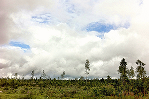 Сборы действительно вышли недолгими. И если бы не падение на скользкой от дождя лестнице с последовавшим приземлением на жесткие доски правым, лишенным подкожного жира седалищем, их можно было б назвать еще и успешными. Но этой глупой и неуместной оплошности мне не удалось избежать - я так стремился быстрее отправиться в путь, что в последний раз спускаясь из домика к уже навьюченному велосипеду неосторожно шагнул на настил и со всего маху практически съехал, как с горки с настила, выбив правым ботинком приколоченную гвоздями ступеньку - деревянный брусок-перекладину. Ступенька улетела в траву, а я, простояв полминуты в согнутом пополам положении - от неожиданности и от огорчения (не от боли, конечно) - взгромоздился на велик и теперь обречен продолжать путешествие с медленно растекающимся по всему правому полупопию иссиня-черным подтёком. Хорошо, что у меня с собой Арника - средство, буквально чудесное от многих травм и болезней. И обязательный элемент походной аптечки. И еще хорошо, что точка падения пришлась немного правее той точки, которой я обычно сижу на сиденье. Первый же подъем в горку заставляет меня вспоминать о вчерашней погоде, как о манне небесной. Дорога на этом участке сама по себе мягче, песчанней, а после дождя, что прошел ранним утром ехать наверх совсем невозможно - приходится вести велик рядом, медленно поднимаясь пешком до вершины подъема. На прочих, пологих участках колеса проваливаются в песок на всю толщину велосипедной покрышки. Что бы хоть как-то этого избегать, пробую ехать быстрее, но это не слишком-то получается все по тем же причинам - песок перенасыщен влагой. Сегодняшнее мое продвижение представляет из себя нескончаемое, монотонное выталкивание колес из расползающегося песка. На второй, максимум - третьей скорости. О движении по инерции можно вовсе забыть - только перестаешь прилагать к педалям усилия, велик в момент останавливается. В такой упорной борьбе с дорогой проходит около двух часов, за которые я успеваю проехать километров девять от силы. Чудовищно мало. Я сейчас продвигаюсь зарастающими уже кварталами - заготовки в этих местах последние пару лет, видимо, не ведутся. Общая схема движения - прямо, поворот на 45 / 90 и снова прямо. Слева - вырубленный недавно квартал, справа - квадрат высокого леса. Еще поворот и теперь в обратном порядке - выруб и сплошной кусок леса. Как шахматы. Я уже сбился со счета и устал считать эти кварталы. Темп движения медленный. Пойдет так и дальше - я заночую в пути и цель путешествия увижу только назавтра. А больше деваться тут некуда - только вперед, не назад. Населёнки по сторонам, кстати, нету. Даже на Верюге деревни расположены густо по сравнению с этой областью. И я углубляюсь в нее все сильнее. Ни человечьего крова, ни транспорта. От Сойги имеется узкоколейка, но идет она в соседний район, в противоположную сторону и населенные пункты Верхнетоемского района жмутся как правило ближе к Двинскому берегу. Есть еще Авнюгский Починок - но он южнее железной дороги и попасть в него можно разве что с Квазеньги или все с той же Двины. Постепенно все мысли мои сводятся к точке, в которую упирается впереди дорога, а постоянное напряжение не оставляет сил любоваться суровым и безусловно прекрасным пейзажем, раскинувшимся по сторонам.