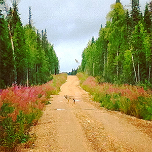 Местность становится дикой, безлюдной. Эту дорогу используют лишь лесовозы, заготовки сейчас не ведутся, вот она и пустует, покинутая, одинокая. Для жителей Соозерска связующей их с остальным миром ниточкой стала железка, основным транспортом - дизельный паровоз и дрезина. Машина для них - местная роскошь, чисто для внутренних сообщений, ехать по автодороге в соседний район им без надобности, да и чересчур хлопотно. Зато для чеканутых туристов путь, проложенный лесовозами - просто находка. И теперь на этом пути попадается все больше знаков присутствия животного мира. Как следов на песке, так и следов жизнедеятельности. Следы лап размыты дождем и едва различимы, прочие же следы, в виде разнообразных скоплений той или иной степени свежести попадаются чаще и чаще и не оставляют сомнений - на тутошней территории животные чувствуют себя спокойно. Вдали от техники и человека. Когда ты милю за милей вращаешь педали по уже ставшей привычной пустынной дороге, любые изменения в своем положении замечаешь мгновенно. Так что, я разглядел его еще издали. Сперва это была просто точка, вкропление в одноцветную насыпь дороги. Только что она была равномерной, стелилась до того самого места, в котором поворот упирается в стену леса, и вот её уже нарушает что-то новое, инородное. Что-то давненько не виденное. Неподвижная по первости точка обретает размеры, движение. Ты отталкиваешься от планеты педалями, а она приближается и вот, можно уже оценить очертания и манеру движения - скачки, невысокие и ритмичные, слегка из стороны в сторону. Ты уже точно знаешь, с кем встретился, хоть это и первая подобная встреча. И ты останавливаешься. Не потому что тебя так учили - вести себя надо спокойно, неагрессивно, уверенно. И не потому, что очень хочется заснять эту встречу, на телефон-то особо не снимешь, и расстояние к тому же приличное. А потому, что понятия не имеешь, что делать дальше. И еще потому, что в этот момент понимаешь - так сбывается мечта идиота. Мой новый приятель, а без сомнения он - Серый Волк или же Canis lupus - хищное млекопитающее из рода волков не спешит отступать от намерений. Не сбавляя скорости приближается, размеренно двигаясь в крайнем левом ряду мне навстречу. У него там какое-то дело, откуда я только приехал. Здесь - его родина. Далекие предки волков перебрались в Евразию с севера Американского континента, перешли океан прямо по льду, сковавшем Чукотское море и свободно распространились по новым для себя территориям - от Японии и Гималаев до русского севера и Европы. Красные волки, Тибетские и ближайший брат нашего серого волка - Индийский - повсеместно теперь обитают в Евразии, потеснив в конкурентной борьбе за измельчавшую, шуструю пищу своих более крупных и неповоротливых родичей. Правда, и сами с тех пор слегка выросли. Рост в холке современного серого волка достигает порой 86 см, длина - 160 см. Взрослый волк, живущий на севере вполне может весить 70 кг. И судя по фотографиям, виденным нами у Осипова это похоже на истину. Поголовье волков на Устье в последние годы приличное. Зимой они не боятся наведываться даже в деревни, видно, в лесу не хватает добычи. Таскают собак прямо с привязи. Так что, встреча со стаей, когда та промышляет охотой чревата последствиями. Я пытаюсь снимать его приближение. У камеры в телефоне угол широкий, так что это не слишком-то пол