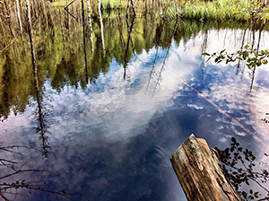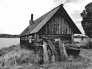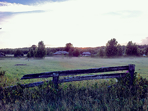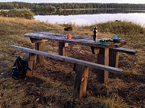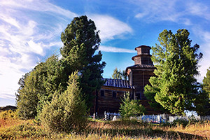 Посещение магазина вызывает улыбку и вызывает в памяти как две капли похожие магазины в Акичкино и Бестужево. Скудный выбор товара - все раскупается сразу же по прибытии поезда - белая печка, странный говор. Хотя не такой, как у старожилов в Акичкино. Вопрос же про пиво вызывает у продавщицы чуть ли не обиду с агрессией - мол, откуда, еще издевается. Чтоб не остаться с пустыми руками покупаю полкило колбасы и возвращаюсь обратно по вечереющей дороге с туманами и комарами, которых вообще, кстати не было все два дня в пути в Соезерье. Туман стелется низко, укрывая поляны, становится сыровато и зябко и я спешу к своей церкви, где меня ожидают ужин, горелка и термо-мешок под кедрами. Ночь спускается в Соезерскую Пустынь. Соседи мои запропали куда-то, не слышно более топора, звуков речи, не видать никакого движения. Небо над озером постепенно темнеет, легкие перистые облака тянутся вдаль, к горизонту. Воздух становится влажным, пахучим и вот замирают последние звуки - ты один на всем острове. Ты и шаги по траве. Позаброшенный монастырь отдыхает средь кедров. Его массивные, крепкие, несмотря на внушительный возраст стены встают то слева от тропки, то справа. Меж колокольней и церковью, среди метровых ветвей виднеется крест и в этих сумерках кажется, что он мерцает будто бы внутренним светом. Бока церкви Троицы потемнели от времени и растрескались и имеют теперь темно-бурый оттенок. Двухъярусный купол с утраченной ныне маковкой венчает восточную сторону храма на высоте многих метров и в таком состоянии выглядит, как буддийская ступа, опоясанная двумя нарядными, некогда, юбками. Деревянная колокольня подымается вровень кедров и ее верхушка подкрашена янтарным закатным солнцем. Все вокруг дышит покоем и какой-то особой, потаённой значительностью. И тебе тоже хочется - проникнуть в покой, причаститься его сокровенного смысла. Наладить дыхание в один такт с покоем, пойти нога в ногу, прислушаться. Обрекши себя на еще один ужин, приготовленный на горелке, отказавшись поработать над храмом сижу на лавке за столиком, установленном здесь же, у берега. Горелка гудит и старается, взрывая воздух шипением, нарушая воцарившееся молчание и раскаляя плоское донце походной посуды. Пол-литра воды, остатки от набранной еще по дороге вскипают за две минуты и на ужин уходит последний пакетик с подобием макарон и китайскими сублиматами. Изделий таких производится прорва. Такая стандартная пища в пакетиках и такие разные судьбы. По всему миру кочуют. И вот пара из них оказалась в самом сердце Архангельской области. Здесь, на столешнице встретились прошлое с настоящим - деревянное, штучное русское зодчество и продукция массового производства. Все, чем снаряжен я сегодня, что так тщательно собиралось в дорогу, что так ценится в нашем мире - и транспорт и техника и одежда - кажется здесь таким временным, преходящим по сравнению с трёхсотлетними стенами, цветущей водою и небом над озером. Захваченный врасплох этими мыслями, иду по тропе вниз по берегу сполоснуть водою тарелку. Над водою - остатки мостков, раскрошившихся, вымокших, но по-прежнему крепких, как и все в этом ламповом, старомодном и несуетном мире. На самом дне возле берега, сполоснувши посуду замечаю вдруг что-то блестящее. Наверное, кто-то из трудников выронил ложку иль вилку. Ан нет, нагибаюсь - очки. Удивит