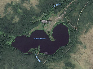 Стоит пройти от дороги какую-нибудь сотню метров и ты обнаруживаешь себя, стоящим на берегу спокойного, тихого озера, окруженного со всех сторон хвойным лесом. Монастырь с этой точки не видно, он надежно укрыт высоченными кедрами так, что даже верхние яруса колокольни и храма, расположившихся в самом начале длинного полуострова не обнаруживают присутствия постороннему наблюдателю. В стародавние времена, во дни основания Соозерской обители монастырь, должно быть, выделялся на фоне ровного озера и различим бывал еще издали, но теперь, когда поднялись, распушились трёхсот-летние кедры уже ничего не увидишь, если не знаешь, что нужно искать. Острый мыс полуострова сильно вдается в середину Соозерского озера, за монастырем следует продолжение кладбища, три-четыре оградки и дальше - тропинка-дорога, идущая до самого берега, где установлен навес с лавочками и столом. Самый край свободного от растительности, с заводями полуострова виден с дороги, до него пятьсот метров по воде или по льду и сегодня, на велике мне приходится объезжать озеро по дороге, делающей петлю и заходящей в Соозерск с севера.