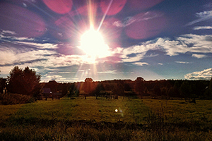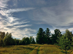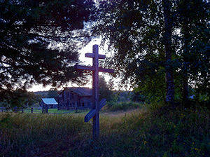 Ласковый, теплый вечер, золото на голубом - синее небо и, наконец-то, летнее солнце - вот как встречает Соозерская Пустынь. Почва все больше песчаная, много ёлок и сосен, августовские желтые травы и кипа пушистых дерев впереди. Дорога, проходя через поле и кладбище тянется прямо к закату и ослепительному светилу, ныряет под сень первых кедров и неожиданно представляет деревянную колокольню. Рядом в земле - большой крест и следом - главное здание, Церковь Живоначальной Троицы. Вот я и на месте. Трудным и полным превратностей и неожиданных встреч вышло мое путешествие и я все еще не до конца понимаю, что я действительно здесь, что мне это не снится, настолько я оглушен нечаянной переменой погоды и ранним, относительно быстрым прибытием к цели поездки. Словно ты ждал и ждал перед запертой дверью и она вдруг, как-то разом открылась ...под окном деревенского дома попросил напиться, а дверь отворила эльфийская королева. И тебя встретила необъяснимая радость и золотистый покой, окунаясь в который забываешь вмиг об усталости, дожде и дороге. Я проезжаю последние метры, приваливаюсь к стволу высокого кедра, ставлю отметку на карте и - конец записи трека.