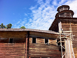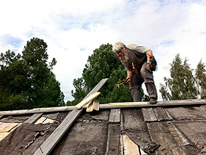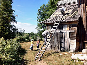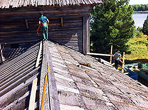 И ведь правда пошел. И поставил. А тем временем девушки, перестав заниматься прополкой перешли внутрь храма и там затянули - голосочками чистыми, как ручьи, что спешат после летних дождей по дороге сюда, в Соезерье - песнопения. Мы стояли на уровне окон и слушали. Поднимались все выше, все к небу и укладывали, приколачивали. А внутри пели ангелы. И воспрянувший Сергий, в обретенных очках и с молитвенником вторил гласом серьезным и строгим. Зелень кедров едва колыхалась у озера, плыли редкие облака, руки заняты были работой. И все мысли укладывались, уминались и растворялись под ласковым Солнышком. А я чувствовал себя молотком, впервые занявшимся подходящей работой. Выполнявшим всю жизнь роль отвертки, ключа, пассатижей и по случаю, вдруг, открывшим настоящее свое назначение. Неожиданно осознавшим, для чего он сюда так стремился. Мы поднялись на крышу. Отсюда видно все озеро - ее блестящая гладь, покрытая мелким волнением. С трех сторон озеро и лишь за спиной где-то поле, закрытое нынче ветками. Из этой точки ты видишь всю незначительность достижений и побед над страхами, комплексами. Понимаешь вдруг разницу между жизнью духовною и обыденной, соображением пользы, здоровья и выгоды. Что есть духовная жизнь? Да бессмыслица. Ну, какой в этом смысл - в отдирании рубероида и замене его на новый, пролежавший лет десять под солнцем, когда пройдет пара лет - и вот он в состоянии старого. Какой смысл менять эти доски, если еще шесть лет назад предыдущие точно так же меняли на новые. И не было бы лучше для общества, если б мы были заняты созидательным чем-то, оправданным, долговечным. С точки зрения здравого смысла - конечно. Но в отличие от спорта и экономики жизнь духовная ставит целью не пользу. Она вредна для здоровья, бессмысленна. А награда за ведение этой жизни стоит по ту сторону от усталости и терпения. Она скорей вопреки и вообще неожиданна. Теперь нашей задачей является отдирание досок и разглаживание старого рубероида перед настилкою нового. Новый лишь относительно свежий и поэтому старый мы оставляем. При хожденьи по крыше нам приходится от конька пробираться до самых углов, ползая под наклоном. Мы привязываемся к коньку с помощью длинных и крепких чалок. Чалку пристегиваем карабином к обвязке, надетой поверх одежды. Выпуская чалку на полную ты дотягиваешься до угла, выбирая свободной рукой приближаешься к ближнему краю или обратно, к коньку. Так и ходим. Отрываем ссохшийся тес гвоздодером, гвозди складываем в карман, а тес скидываем. Сергий следит за порядком, приколачивает, парни поднимают наверх свежие доски, я в основном отдираю. В крышу легко провалиться - местами она вовсе прогнила и тонкий слой снизу едва прикрывает прорехи.